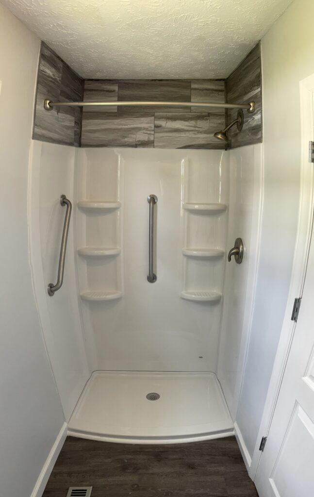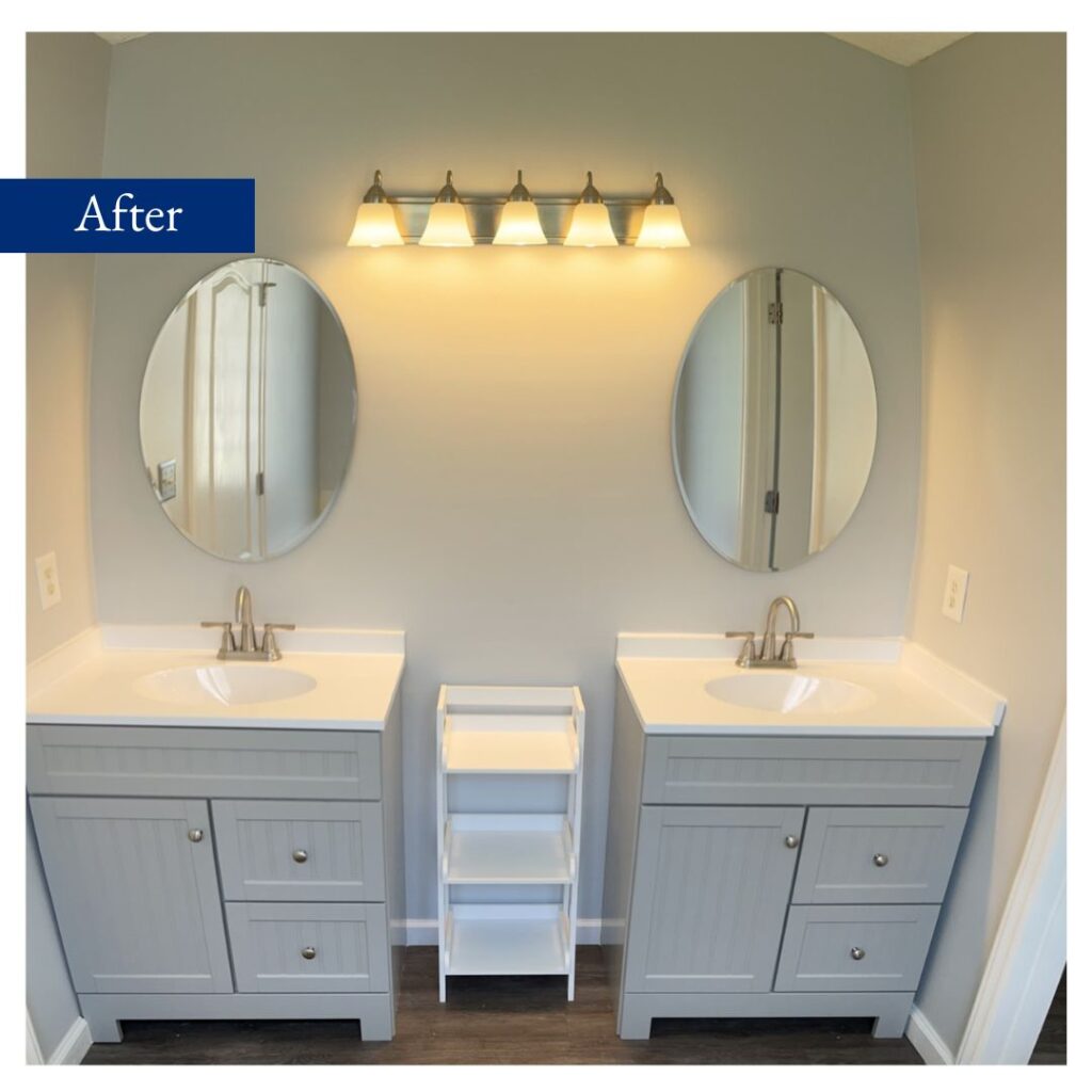 Our client chose a durable luxury vinyl plank flooring, separate his and hers vanities, and a new shower insert with tile surround. We were so happy to give this bathroom a fresh makeover and for our fantastic clients to have a space they can enjoy for years to come.