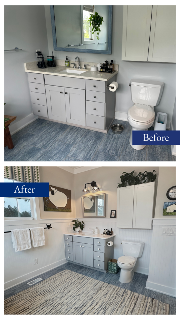 The first order of business was adding wainscotting around the bathroom to elevate the look and add a custom finish. Next, we updated the “his” side vanity by changing hardware, countertops, and plumbing fixtures and utilizing the existing vanity.