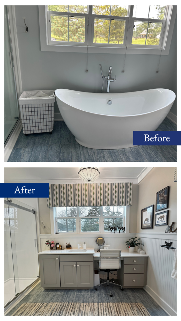 The “hers” side was a bigger change! They did not want to keep their tub, but replace it with a matching vanity to the other side. We were able to build a matching cabinet with a makeup vanity so they could each have their own functional space.