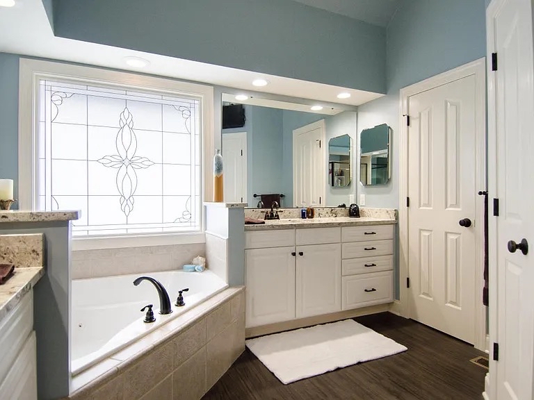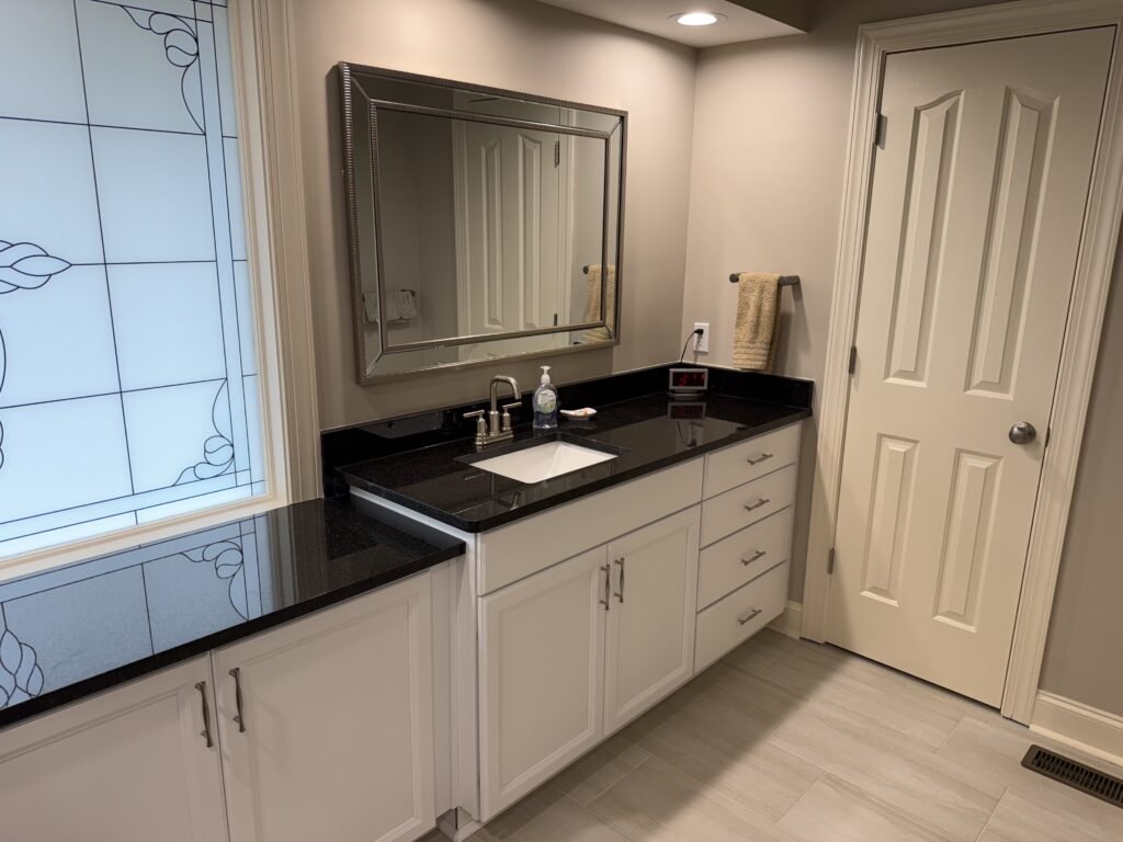 That giant jetted tub? It was taking up prime real estate. Instead, we installed a built-in makeup vanity, complete with cabinet and counter space. Now, every inch is being put to good use.