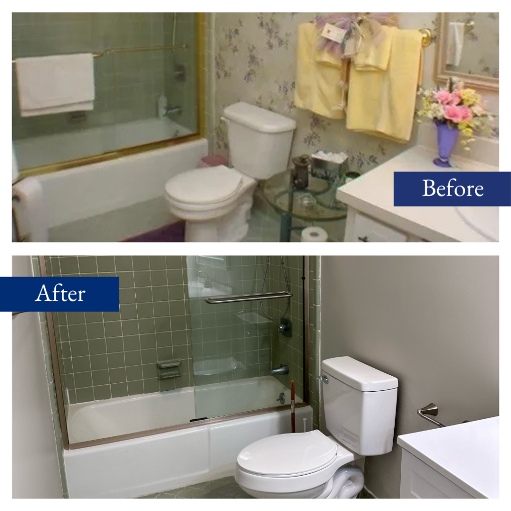 We were thrilled when we got the call from a Whispering Pines homeowner who wanted to update a tired bathroom space by removing outdated wallpaper, replacing the shower doors, painting the walls, cleaning up the existing tile, and replacing the vanity and countertop.