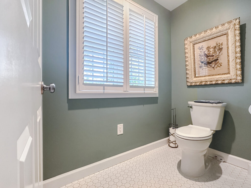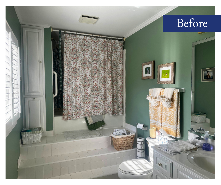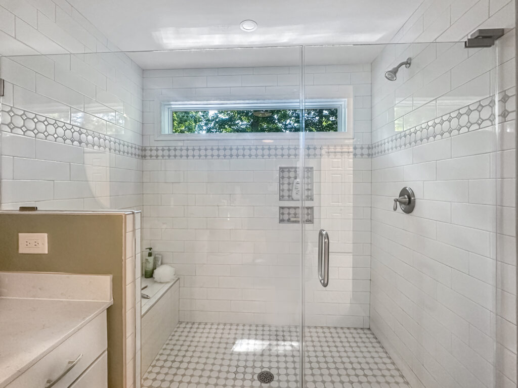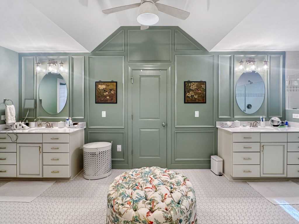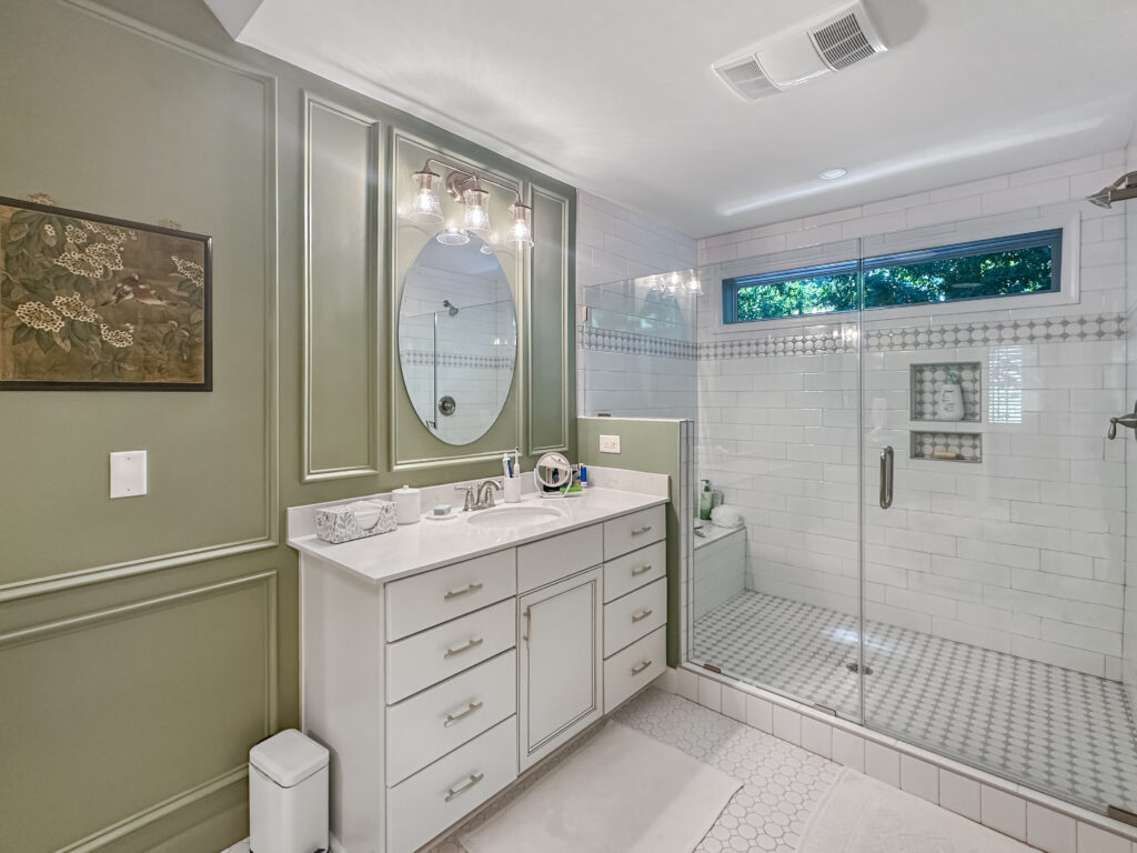 There was also a stunning transformation on the inside! Going with the character of the home, the homeowners chose a timeless and classic white floor tile paired with a statement green wall with picture-frame wainscotting. The bathroom also provides access to a custom walk-in closet between the his and hers vanities. The walk-in shower with bench is also a statement, with the white subway tile, gray and white deco, new window for natural light, and glass doors. We loved their vision for this space and were so happy with the result!