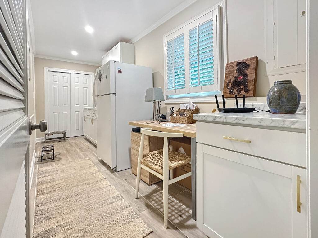 The homeowner made the request that while we were doing the major plumbing changes, that we relocate the washer and dryer upstairs in the hall next to the primary suite. We then converted this mudroom into an a more functional landing zone! The pets got some designated space, and the homeowners got some extra storage and functionality.