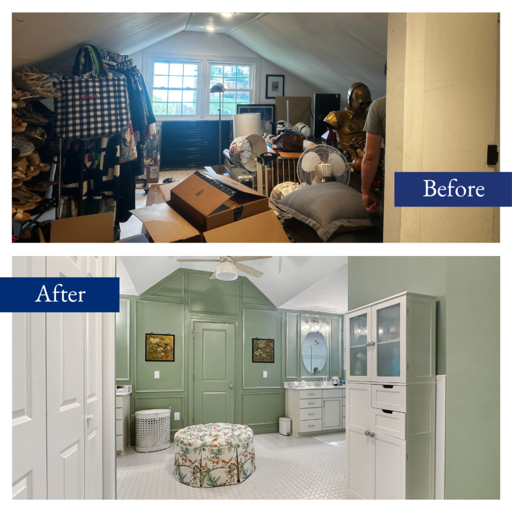 That still leaves the old primary bathroom! The homeowners chose to turn this into a nice private office, reading space and storage closet; just what they needed! We converted the bath area into a closet, matched the hardwood flooring to the existing bedroom flooring, and added fresh paint.