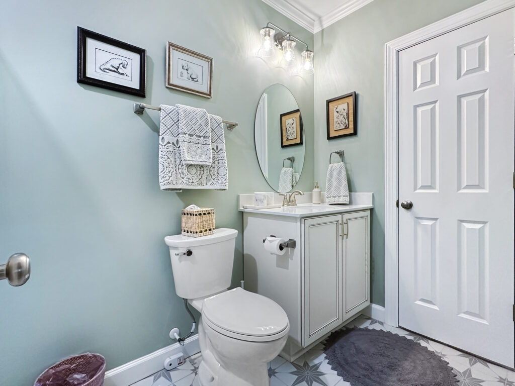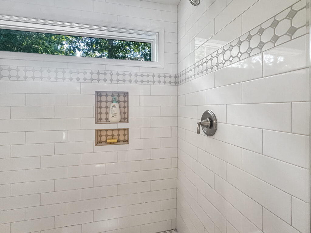 The guest bathroom got a total refresh in the existing footprint! A new vanity, toilet, and tile flooring. But the statement in this room is the deco tile shower! This pattern really elevates the design of this space.